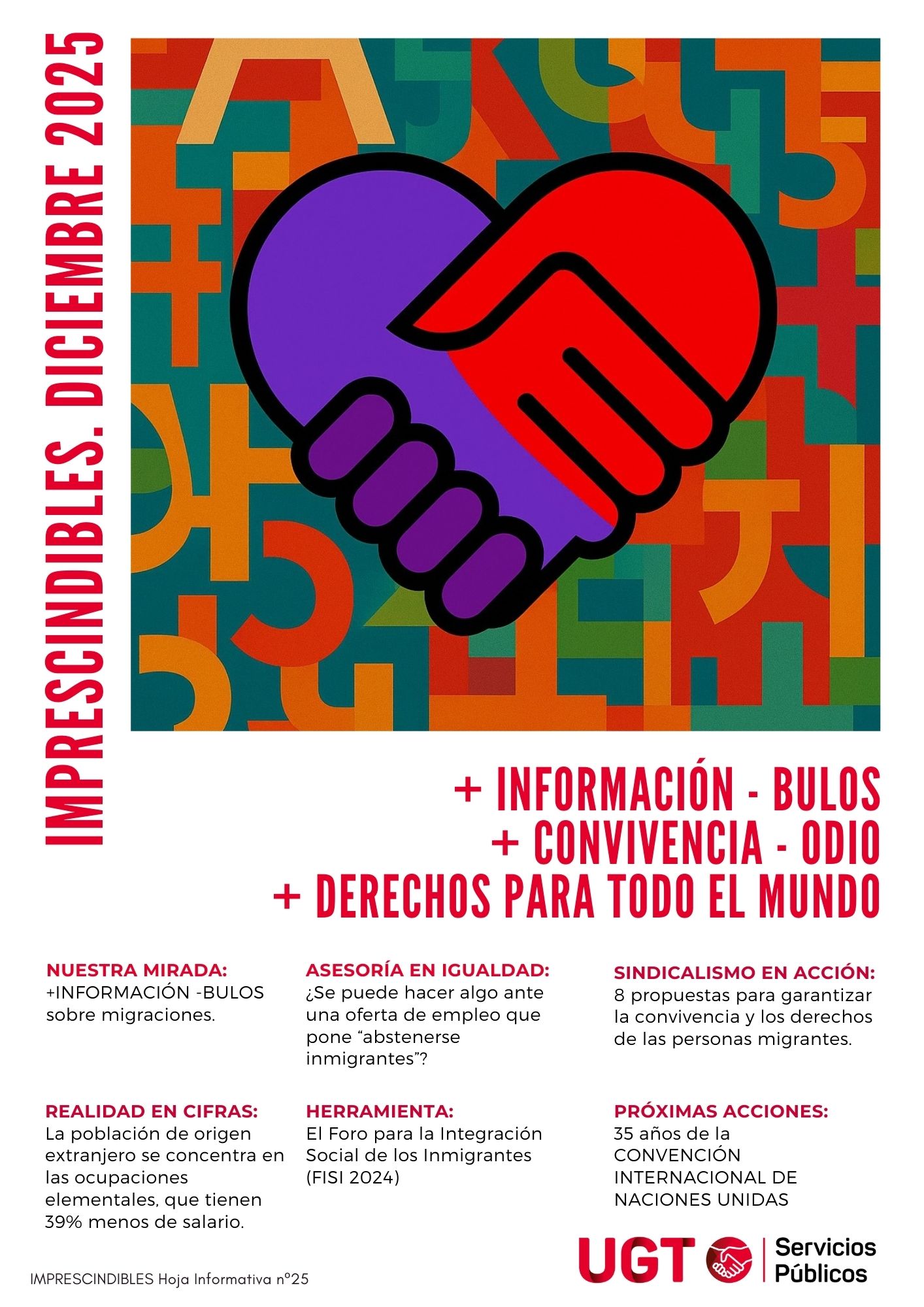 Hoy en concreto presentamos la publicación IMPRESCINDIBLES DICIEMBRE 2025 donde vamos a analizar y desmentir diferentes bulos existentes sobre migración y servicios públicos, facilitaremos cifras sobre condiciones de vida de las personas migrantes y conoceremos herramientas para tratar de acabar con el racismo.