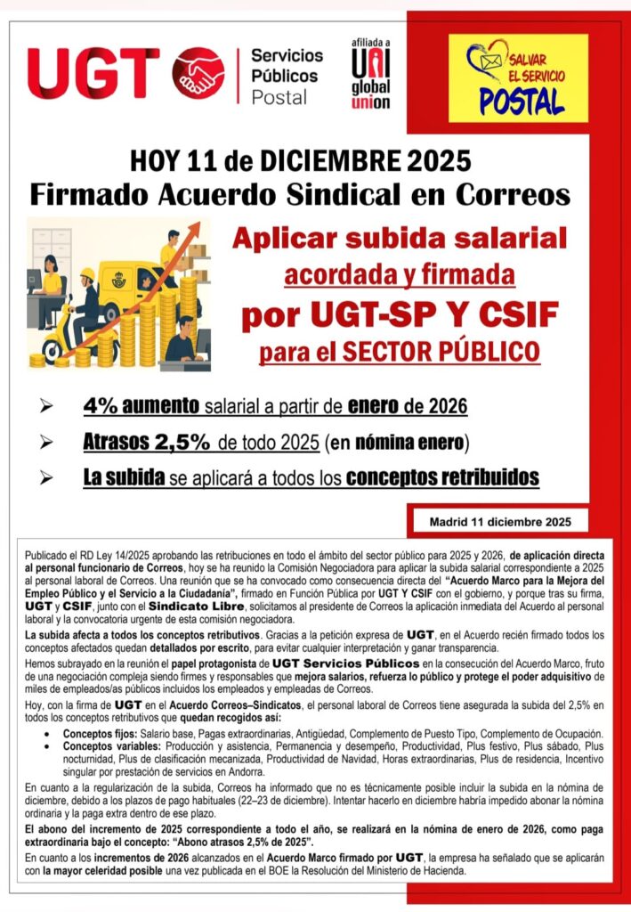 Con la firma de UGT en el Acuerdo Correos–Sindicatos, el laboral de Correos tiene asegurada la subida del 2,5% en todos los conceptos retributivos que UGT ha solicitado que se expliciten en el acuerdo: Conceptos fijos, Salario base, Pagas extraordinarias, Antigüedad. Complemento de Puesto Tipo, Complemento de Ocupación, Conceptos variables, Producción y asistencia, Permanencia y desempeño, Productividad, Plus festivo, Plus sábado, Plus nocturnidad, Plus de clasificación mecanizada, Productividad de Navidad, Horas extraordinarias, Plus de residencia, Incentivo singular por prestación de servicios en Andorra.