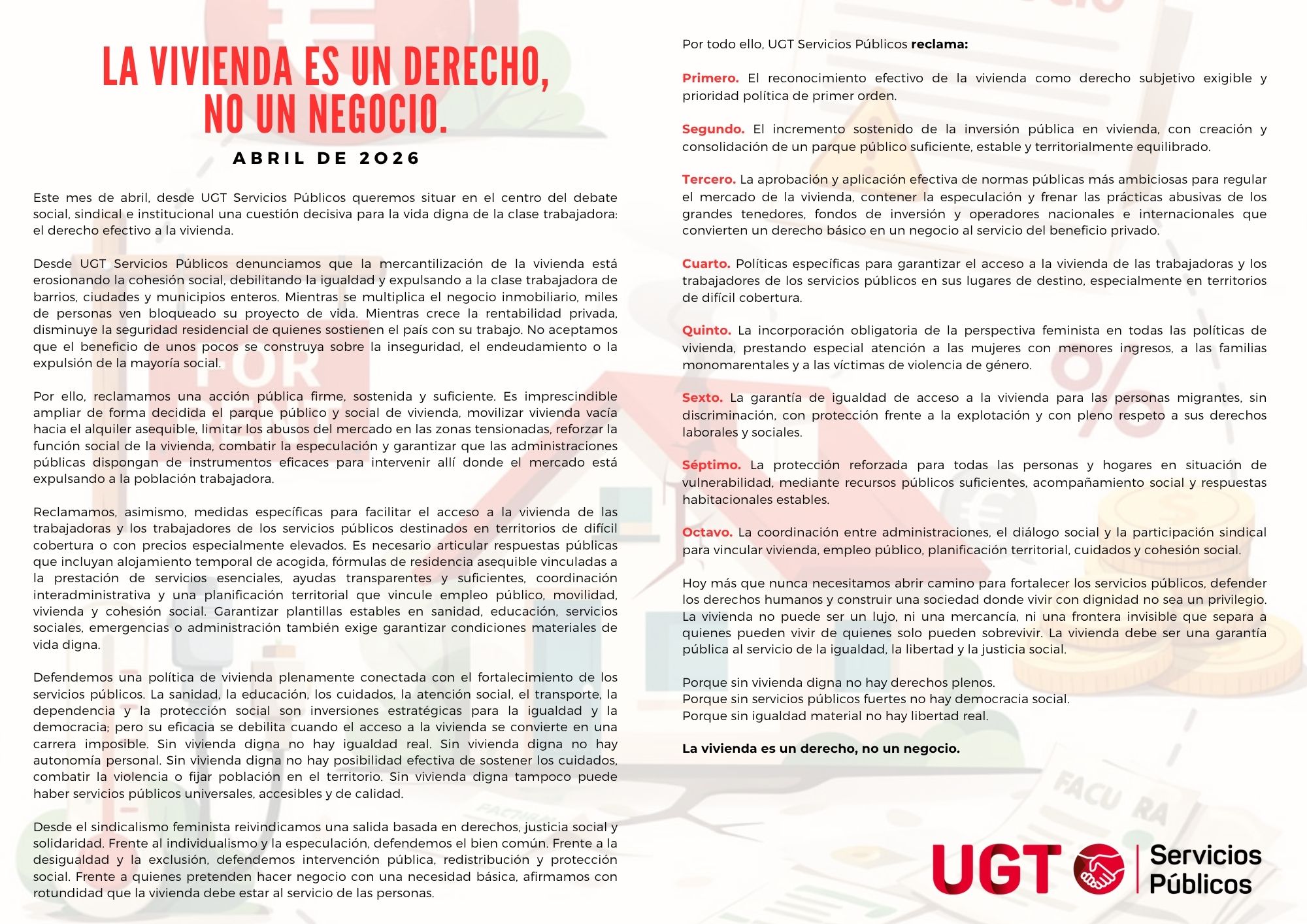 Desde UGT Servicios Públicos reclamamos una acción pública firme: más vivienda pública, control de la especulación y políticas que garanticen que vivir con dignidad no dependa del mercado.