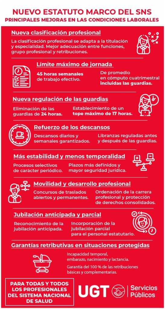 Las mejoras recogidas en el nuevo Estatuto Marco afectan a aspectos laborales fundamentales, como los derechos del personal, la clasificación profesional, la jornada de trabajo, el acceso al empleo, la jubilación anticipada y parcial, la conciliación o la salud laboral, entre otras materias esenciales. Todas ellas, además de afectar directamente a todo el personal estatutario, contribuirán a una mejora en la calidad y seguridad de la atención que se presta a la ciudadanía, apuntaron.