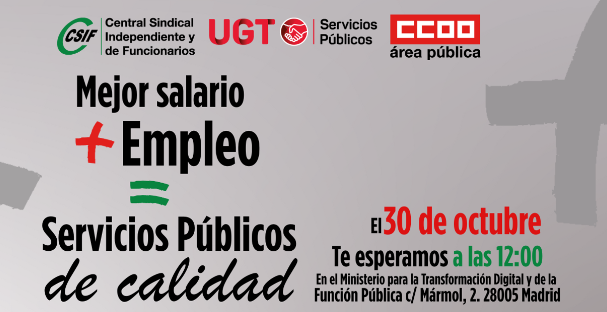 UGT. CCOO y CSIF inician este jueves, 30 de octubre, un calendario de movilizaciones en toda España para denunciar el bloqueo de la negociación colectiva por parte del Ministerio de Función Pública, que impide un nuevo acuerdo salarial, entre otras reivindicaciones pendientes.